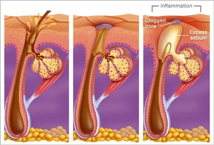 Why does acne usually start when you’re a teen? Puberty causes your body to make more hormones, which lead your skin to make more sebum, an oil that comes from your pores. Too much sebum and dead skin cells can clog pores and trap bacteria inside. The germs thrive and acne starts. It can show up as whiteheads, blackheads, and pimples.